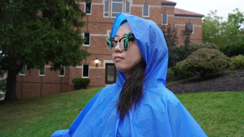 Chindogu, which involves creating ingenious yet impractical solutions to everyday problems, my work explores the absurd intersections of human behavior, culture, and technology. In Dumbbells, the fusion of food and exercise equipment humorously critiques society’s obsession with health and wellness, highlighting the impractical extremes of contemporary fitness culture. In Wipers, a performative interaction with custom glasses, wipers, and simulated rain reflects humanity’s often absurd attempts to control nature through technology, questioning whether innovation truly enhances our connection to the world. Both works blur the boundaries between utility and absurdity, prompting viewers to reflect on human ingenuity, vulnerability, and the tension between adaptation, control, and acceptance in daily life.