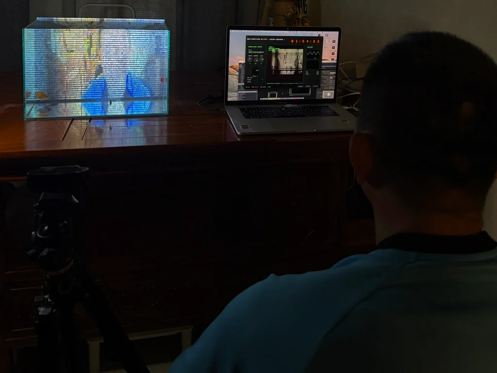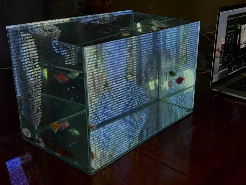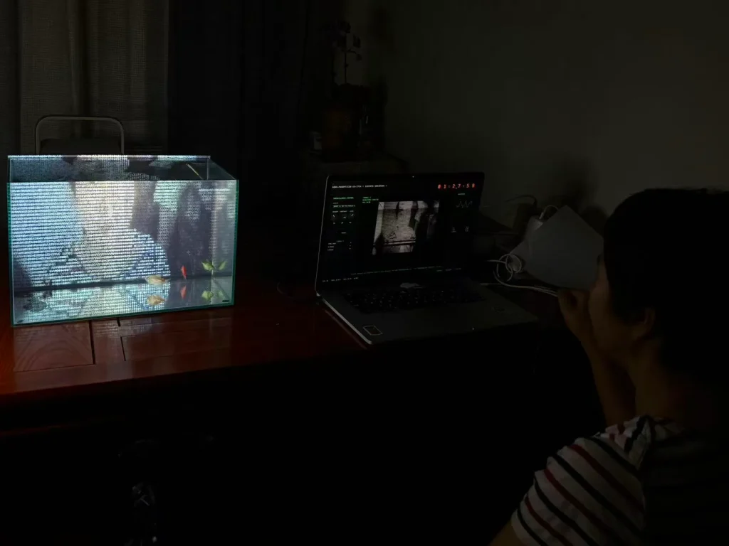 Non es piscis explores the entangled relationships among biological life, algorithmic perception, and human observation within a real-time streaming ecosystem. By tracking three live fish with YOLOv11 and allowing online viewers to select individual fish to trigger a light-tracking system in TouchDesigner, the installation creates recursive visual loops in which fish, algorithms, and humans continuously observe and generate one another. Viewer faces captured by cameras are projected onto a holographic mirror membrane behind the tank, amplifying this feedback loop and collapsing the boundaries between subject and object, watcher and watched, life and technology.