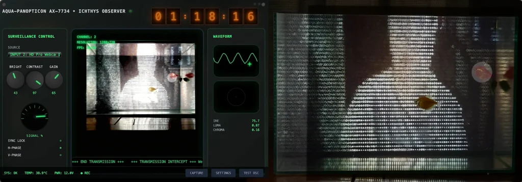 By fusing living organisms, human perception, and algorithmic mediation, the installation reframes streaming as a philosophical and artistic site where human and nonhuman life co-constitute one another. It highlights the emergent asymmetries of power and visibility in mediated ecosystems, encouraging reflection on who—or what—controls the act of being seen. Ultimately, Non es piscis is both mirror and lens: it makes visible the recursive loops shaping our contemporary posthuman experience and challenges viewers to reconsider the boundaries between life, technology, and perception.