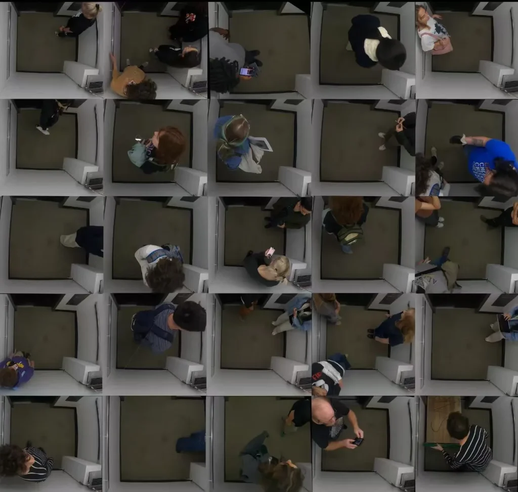 The elevator floor is divided into four zones, each corresponding to a unique human voice. Using a pressure-sensitive floor, an Arduino board, and an overhead camera, the system tracks passengers’ positions and movements in real time. When someone steps from one zone to another, voices fade in and out, like editing moments in time, creating a living sound composition. As more people enter, the voices layer together, forming a rich soundscape that reflects increasing social density. The visuals evolve from a single quiet screen at the beginning to twenty-five simultaneous screens at the end, representing the progression from interactions with system-generated sound to the system being gradually overridden, ultimately breaking the silence and enabling human-to-human communication.